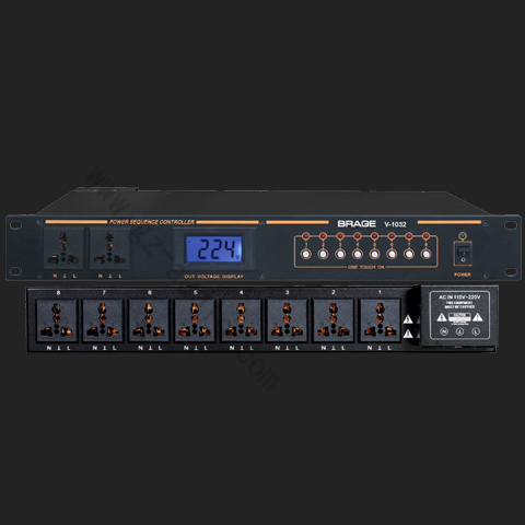 ★V-1032电源时序器用于比较大型的扩声系统,使系统操作更加方便★采用微机控制,延时开合时间准确,工作可靠★面板使用两种不同的插座,使用灵活,带电压显示